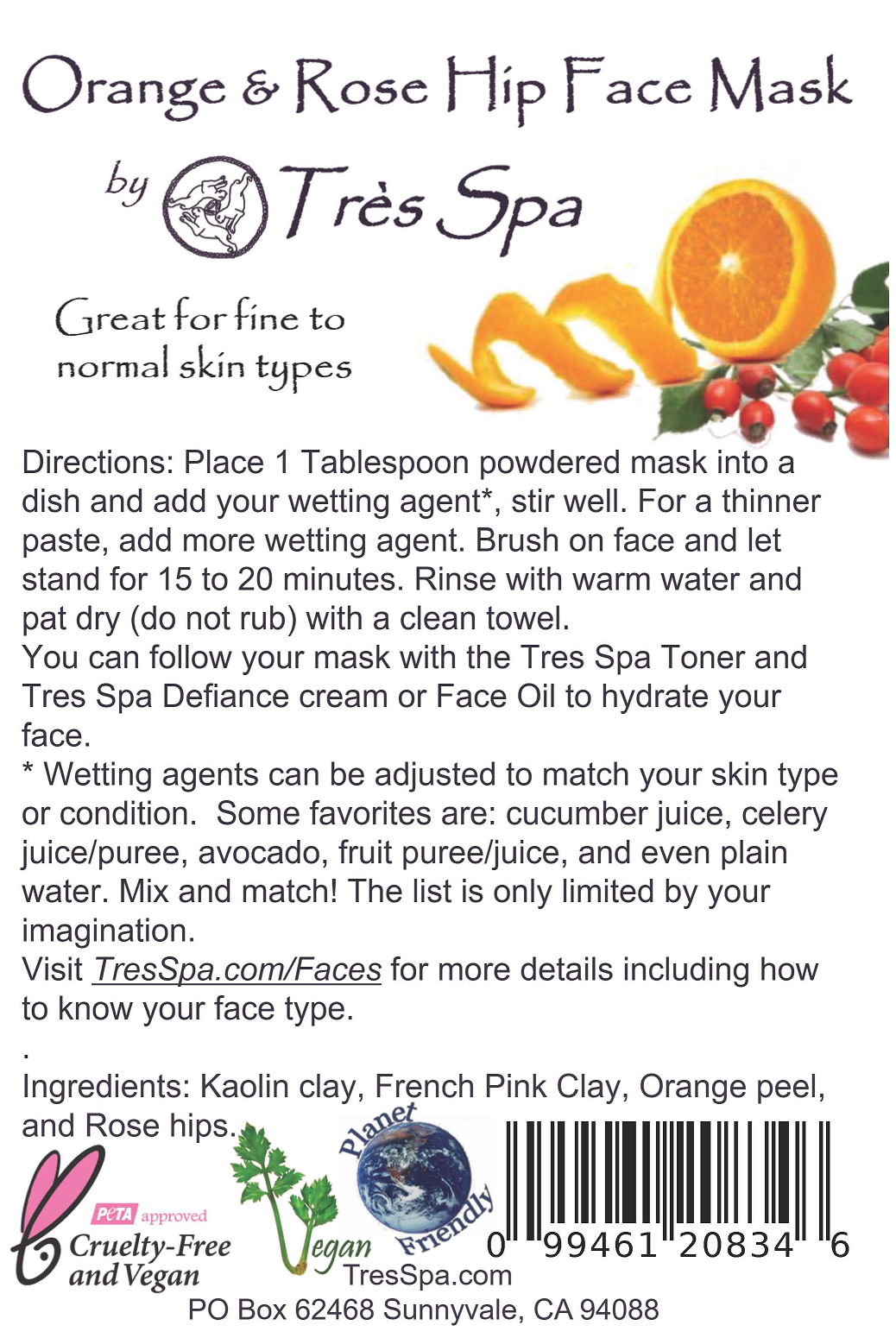 The Très Spa Orange Peel & Rosehip Face Mask. Face masks help cleanse tighten and tone the face. Masks also slough off dead skin cells leaving your skin feeling fresh and smooth. We started with the gentle foundation of French Pink clay then added some amazing ingredients high in vitamins and nutrients. Rosehips are reported to be high in vitamin c and antioxidant flavinoids which help fight free radicals. You know, those things that make us look aged and dull. Orange peel not only gives your skin that glowing appearance, it has also been said that orange peel helps boost collagen production making this mask perfect for mature skin.